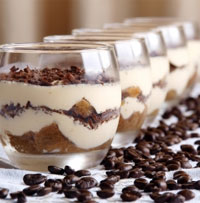 تبلل قطع البسكويت بالقهوة الباردة و يوضع القليل منها في كأس التقديم ثم القليل من خليط الكريم و الجبنة و مرة آخرى يوضع القليل من البسكويت المبلل و فوقه القليل من خليط الكريم و الجبنة, يرش محسوق الكاكاو و برش الشوكولا على سطح الكأس و يترك في البراد ل 3 ساعات على الأقل ثم يقدم.