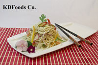 في مقلاة ساخنة نضع القليل من زيت السمسم و القليل من زيت دوار الشمس دي لايت ثم الخضارالفليفلة الملونة، الملفوف الأحمر، الملفوف الأبيض، الفجل، البصل اليابس، البصل الأخضر، الجزر و البندورة إلى أن تذل الخضار مع التقليب المستمر ثم نضيف نودلز القمح المسلوق سابقاً و يسكب وعاء مزيج الصلصات و يقلب جيداً حتى تبدأ الصلصة بالغليان تقلب النودلز تقدم فوراً.