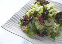 توضع قلوب الخس العربي، الفرنجي,الفرزية, الآيس بيرغ, الشومر,الخيار,البصل الأخضر,الخرشوف,البندورة الكرزيةفي وعاء عميق للخلط، ترش جبنة البارميزان و يسكب الدريسينغ فوق الخضار السابقة مع التقليب برفق، تسكب سلطة الخضار في طبق التقديم و تزين بعرق شومر صغير.