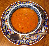 يوضع وعاء طهو عميق على النار مع الزبدة و الزيت عندما تسخن الزبدة و الزيت يضاف البصل و يقلب حتى يذبل ثم يضاف اللحمة, الفلفل الأبيض, رشة ملح خيفة جداً, الكرفس, الزنجبيل, القرفة و تقلب على نار هادئة مع البصل إلى أن يتغير لونها تضاف البندورة, رب البندورة، الحمص, العدس, الكركم, البابريكا, 2 ليتر مرقة دجاج مغلية, المعكرونة، رب البندورةتخفف النار، يغطى وعاء الطهو و يترك لمدة 40 دقيقة، يضاف المزيد من مرق الدجاج المغلى عند الحاجه.