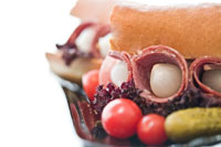 تقدم باردة مع مخلل البصل الفضي بحسب الرغبة, حبات البندورة الكرزية و حبات إضافية من مخلل الخيار.